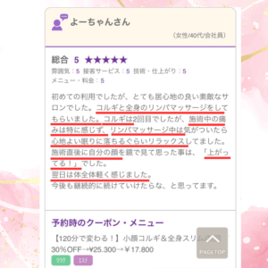 また、いつも薬草蒸しの他、フェイス&ボディを受けており、全身癒していただいてもらっています。