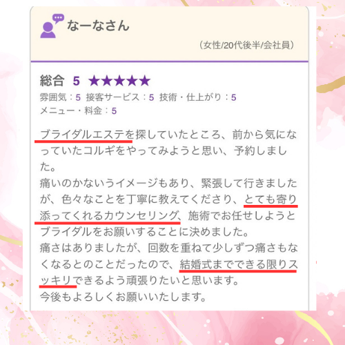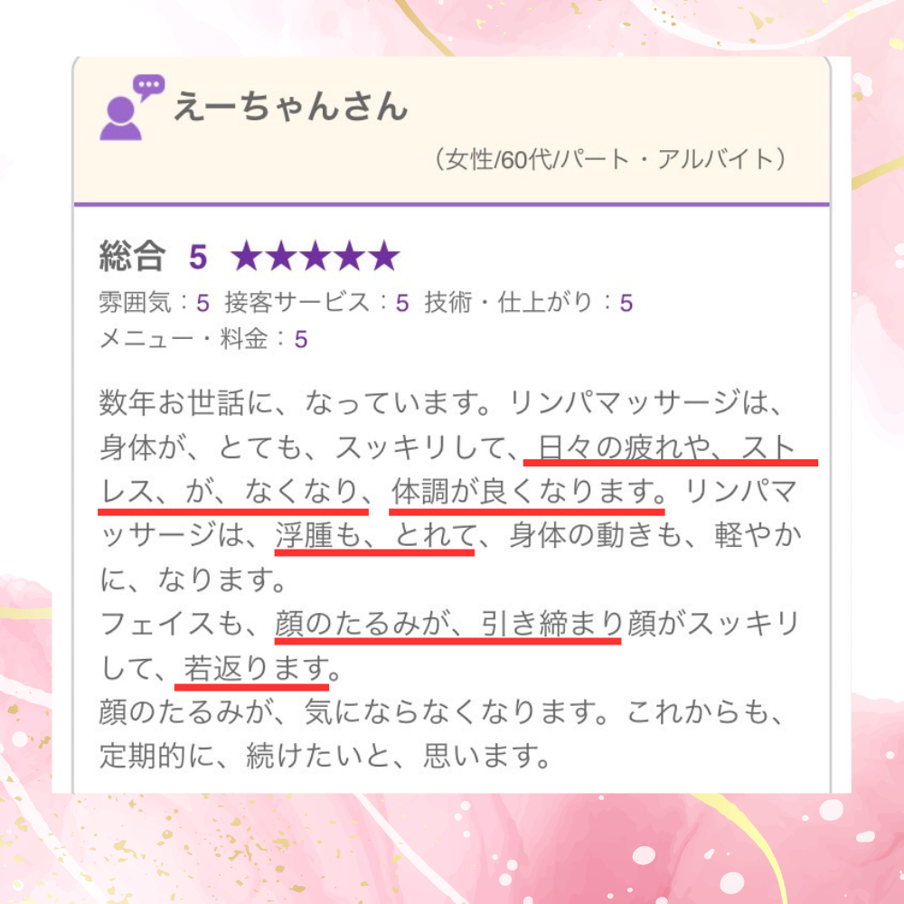 数年お世話に、なっています。リンパマッサージは、身体が、とても、スッキリして、日々の疲れや、ストレス、が、なくなり、体調が良くなります。リンパマッサージは、浮腫も、とれて、身体の動きも、軽やかに、なります。 フェイスも、顔のたるみが、引き締まり顔がスッキリして、若返ります。 顔のたるみが、気にならなくなります。これからも、定期的に、続けたいと、思います。