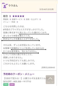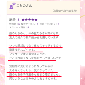 マッサージも丁寧で気持ちよかったです。終わった後はむくみのひどい足がとても軽く、目の周りや頬もスッキリしていました。翌朝は肌ツヤが良くてびっくりしました。