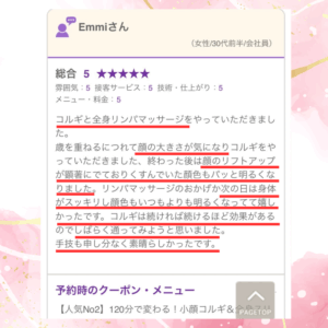 初めてのリンパマッサージでしたが、丁寧にしっかりと流してもらえて感動しました。