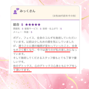 日々疲れやストレスを感じても、ケーズハートさんに行けば心身ともにスッキリしてリセットされ、仕事や家事をまた頑張ろうと思えます。