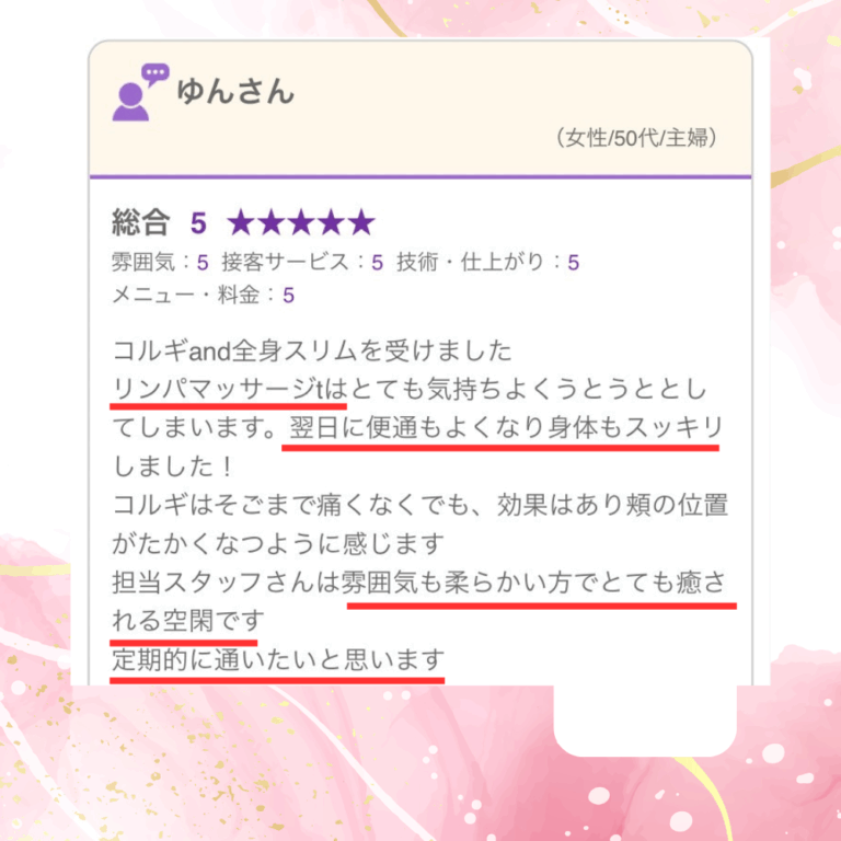 お心遣いのあるお話にも癒されました。翌日ファンデーションのノリが良かったことに驚きました。リンパの流れがよくなったからなのか、肌の触り心地もよくなっています。
