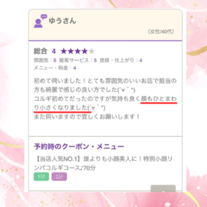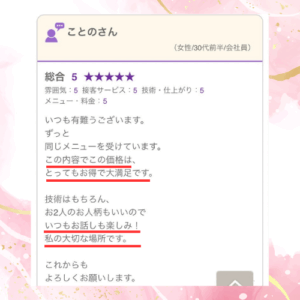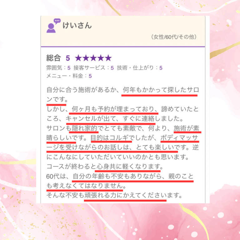 とっても満足感たっぷりでした。効果も直ぐ実感でき、通い続けたいサロンを見つけた!!!という嬉しさにも満たされました。一軒家サロンならではのお庭の木々やベンチ、鳥のさえずりなど、心の癒やしも得られ大満足です。